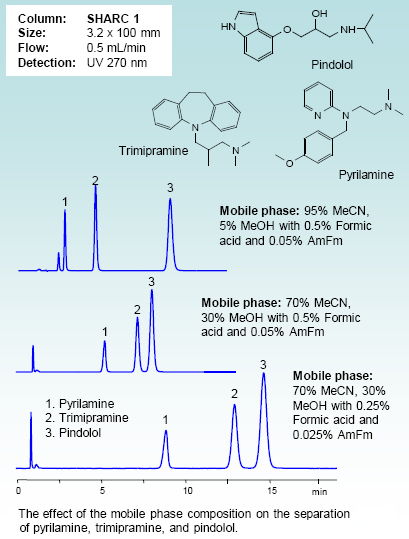 SHARC™ columns are the first commercially available in which the primary separation mode is hydrogen bonding and use the hydrogen bonding interaction of hydrogen atoms within the stationary phase with analyte molecules containing electronegative atoms such as oxygen, nitrogen, fluorine.