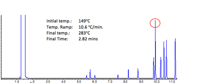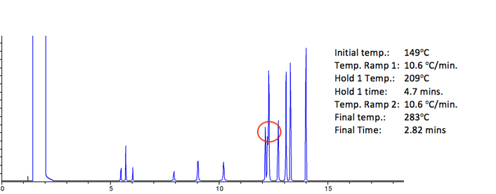 As can be seen from Figure 2, the analysis successfully separates at 13 components (minimum RS = 1.53), however run time is reasonably long and the later eluting peaks are beginning to broaden significantly – which summarises nicely the disadvantages of isothermal versus gradient temperature programmed analysis.