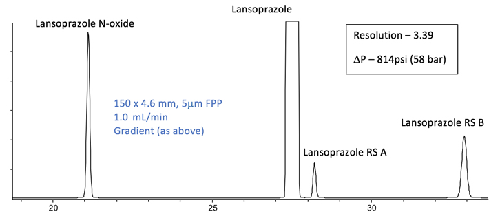 In this case we wish to translate the USP method for Lanzoprazole and it impurities, which uses a 150 x 4.6mm column with 5μm FPP, to an SPP column which uses 2.7μm particles.