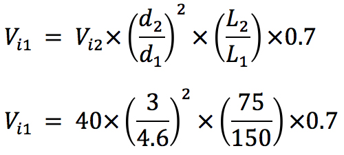 Another important adjustment is the volume of sample injected. As column dimensions are reduced, and the particle morphology is changed, the amount of stationary phase available is reduced. This risks overloading the column, fronting peaks, plus reduced accuracy and reproducibility of quantitation. We have found the following formula very useful, which is based on a well-established mathematical relationship. However, it further reduces the injected volume by 30% to account for the marginally lower loadability of the superficially porous particles. Reducing by a further 30% is generally more than is required to account for the reduction in available surface area, and the injection volume may be increased empirically if extra sensitivity is required.
