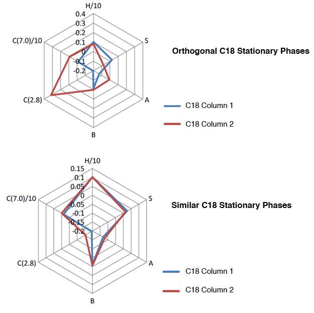 Figure 1: Radar plots of PQRI column classification data showing similar and orthogonal C18 phases
