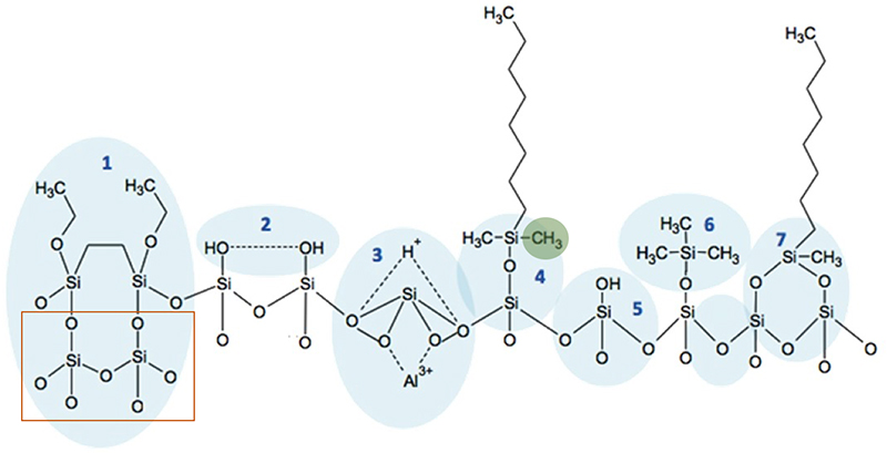 Section 1 - various types of silica which are used to construct stationary phase particles.  The traditional polysiloxane is shown in the box region and this fully inorganic polymer has reasonable pH and mechanical stability.  Some manufacturers use organic / inorganic silanes (methyl - polysiloxane or ethyl-polysiloxane) to impart better pH stability.