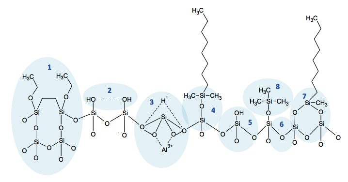 Figure 1 shows a silica surface containing important elements in reversed phase chromatography – of course this is a contrived diagram and no surface would be expected to contain all of these elements in such close proximity.
