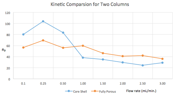 It should be pretty obvious from the peak capacity values on the y-axis that the different columns are best at different flow rates and that the best performance comes from the core shell column at flow rates of 0.25 and 0.5 mL/min. At this flow rate with this column the number of peaks which can be separated in unit time is highest. This is a conundrum as the methods needs to be as fast as possible.