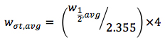 So from the peak widths reported by the system I add them all up and divide by the number of peaks found, then use the equation above to get the 4σ deviation which represents the peak width at the baseline.
