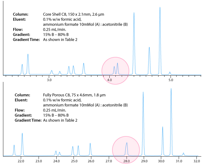 The phase on both columns was purported to be the same by the manufacturer (although I’m always a little skeptical regarding the portability of selectivity when changing particle morphology). I have a UHPLC system connected to the mass spectrometer and therefore the possibilities for flow and pressure are pretty wide ranging and the extra column volumes are low.