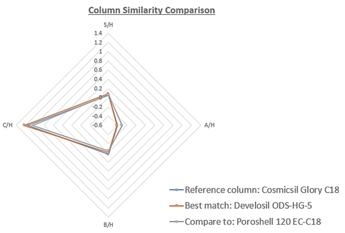 Perhaps this is the ideal time to place more focus on the selectivity databases which exist, which can help to demonstrate the ‘equivalence’ of selectivity of two different phases.  At ACA Laboratory Services, we use a model based on the PQRI selectivity database (Hydrophobic Subtraction Model, HSM [1]), alongside some other key metrics to help clients understand the equivalence of reversed phase HPLC stationary phases.  Alongside the HSM model we use a linear regression model for measuring the equivalence of each selectivity characteristic [2,3] and other checks to demonstrate the theoretical equivalence of columns and have found success with this model – some examples of reports and graphical comparisons are shown below for reference.