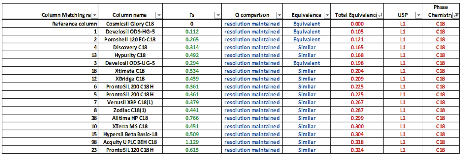 The Fs comparison number is the PQRI / HSM similarity factor, the Total Equivalence metric is based on a regression analysis of the differences in each HSM factor between the two columns, each reduced by the hydrophobicity and the Q comparison predicts the likelihood of critical resolution being maintained from the original separation. The model is built to take into account the presence and strength of acids and bases within the analyte mix as well as the eluent pH.