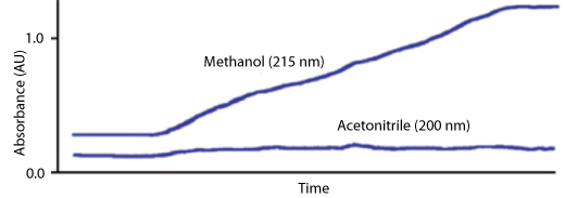 Remember that to avoid sloping baselines during gradient elution (Figure 3), one should avoid monitoring at lower wavelengths as solvents and additives are more likely to absorb in these regions (Table 1), and any change in the absorbance of the eluent (i.e. as the composition changes during gradient analysis) will lead to baseline drift effects.
