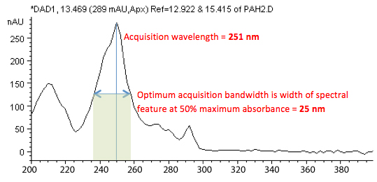 From Figure 4 we can see that the acquisition wavelength is typically chosen to coincide with the maximum absorption from the UV spectrum.  The bandwidth is set according to the width of the spectral feature at 50% of the maximum absorbance as shown.