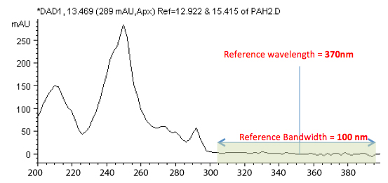 Reference bandwidth is an arbitrary choice depending upon noise obtained but is typically 100 nm, to give minimal baseline drift due to changes in Refractive Index as the eluent composition changes, as well as minimum noise.  Figure 5b demonstrates the effects of changing reference bandwidth on a typical HPLC separation.