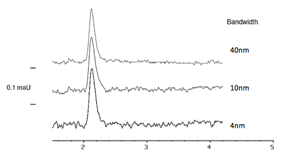 The bandwidth parameter in diode array detection is related to the number of diode responses which are averaged in order to obtain a signal at a particular wavelength. A wide bandwidth has the advantage of reducing noise by averaging over a greater diode range. Noise is random; therefore, averaging the response over a large range of diodes will reduce noise. As the bandwidth is increased, the signal intensity (detector sensitivity) increases as some diodes will result in a lower absorbance compared to a reading using only the single most intense wavelength (λmax). A wide bandwidth results in a larger range of wavelengths being averaged when producing a spectral data point, which results in a loss of spectral resolution.
