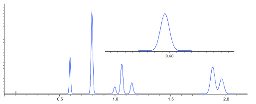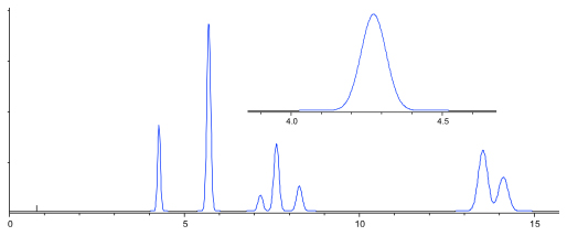 At 2.0 mL/min. eluent flow, this peak represents an elution volume of 0.35 minutes x 2.0 = 700 µL. Therefore, maximum flow cell volume would be 70 µl – easily achievable.