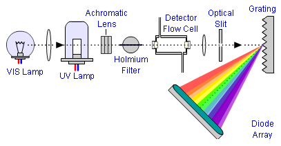 In this typical Diode Array detector (so called 'Reversed Optics'), light from a Tungsten and or Deuterium lamp is focussed onto the detector flow cell, where light of a certain wavelength will be absorbed according to the electronic configuration of the analytes flowing through the cell. The slit is used to control how the light falls onto the grating, and ultimately controls the balance between spectral resolution and sensitivity (signal to noise). The grating is used to split the emergent light into its constituent wavelengths which then fall onto a diode which measures the light intensity across the selected wavelength range.
