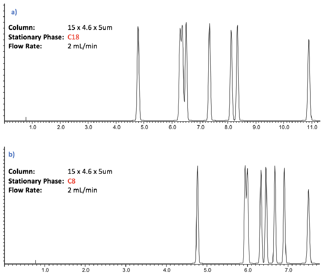 Figure 2: Selectivity affects in gradient HPLC analysis with various buffered eluent systems and column chemistries for a sample of basic and neutral pharmaceutical analytes.  a) & b) variable ionic strength / variable pH gradient with C18 and C8 stationary phase respectively, c) & d) same separation under constant ionic strength conditions, separation e) C18 separation under constant ionic strength and pH conditions.