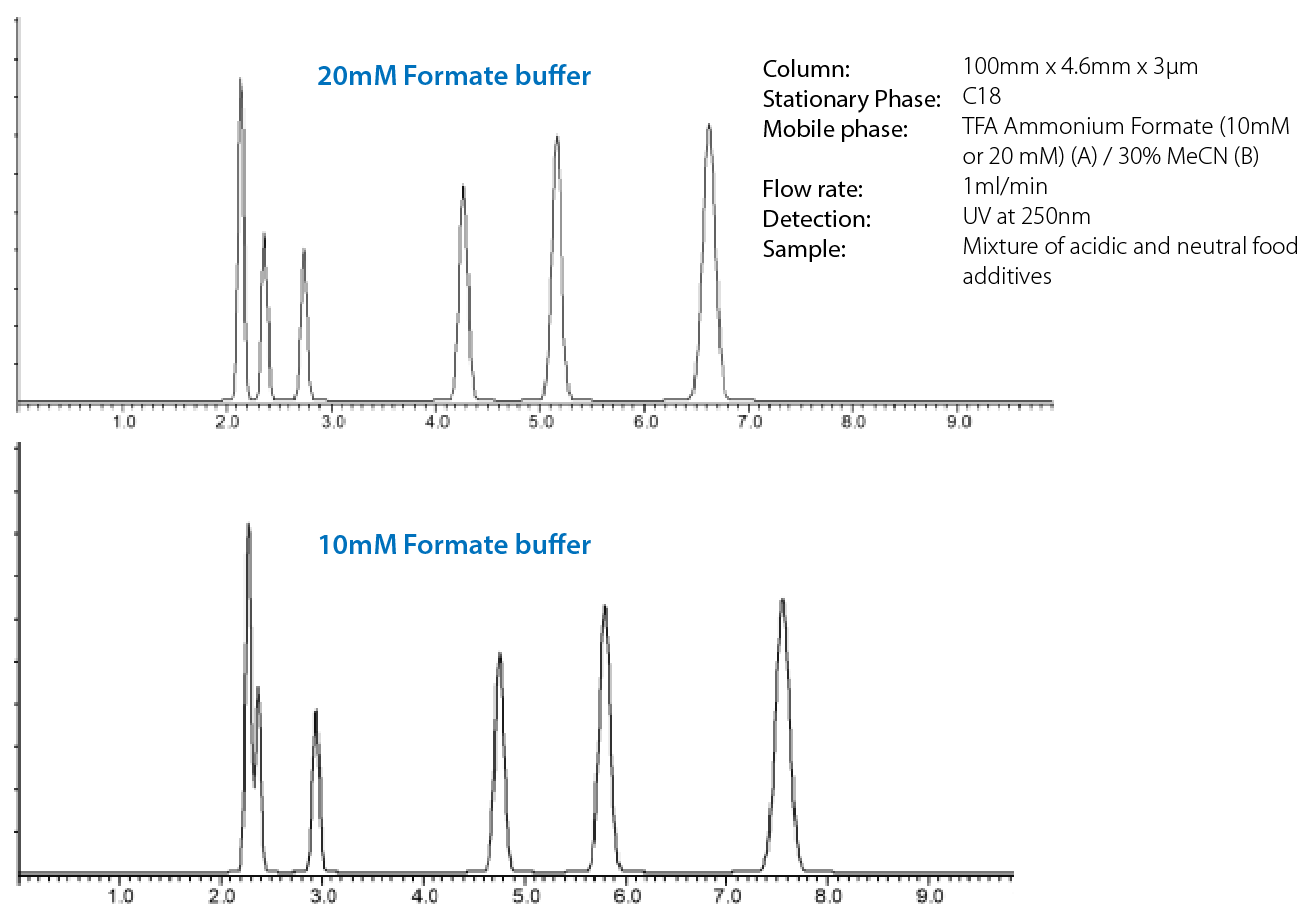 Figure 1 shows the difference in selectivity obtained in an isocratic separation when the buffer strength is altered.