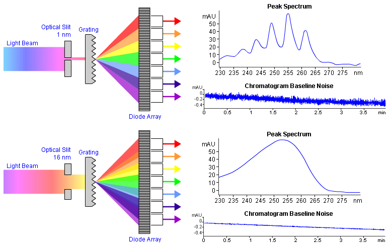 If qualitative analysis is required, for example if peak purity measurement or compound identification is required, then narrower bandwidths are typically chosen. Conversely wider bandwidths are chosen to optimise detector sensitivity.