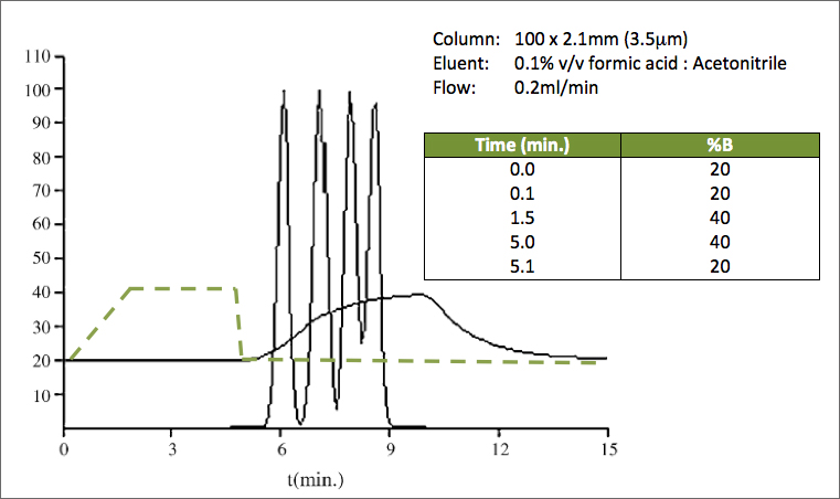 We also may have examples where gradient methods are not sufficiently reproducible or where our equipment struggles to form a gradient at high percentages of acetonitrile or when running ‘quick’ gradient methods.