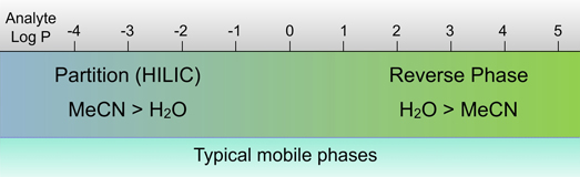 General schema for analyte Log P value versus separation mode of choice