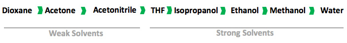 It is generally accepted that the organic eluent content in HILIC mode is 70% or greater. The most popular weak solvent is acetonitrile, due to its aprotic (intermediate polarity, lacking an acidic proton) characteristic which encourages retention of polar analytes. Other ‘weak’ solvents may be used in HILIC mode and the general solvent strength series for HILIC separations is: