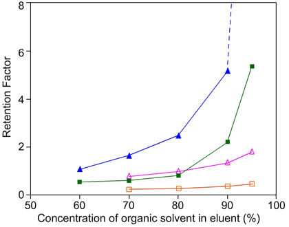 Retention factor as a function of acetonitrile concentration (closed symbols) or methanol (open symbols) cytosine(triangles) adenine (squares). (Reproduced with permission from Merck Sequant, Umeå, Sweden)