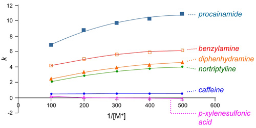 Plots of retention factor vs. 1/[counter-ion concentration] for silica HILIC columns.