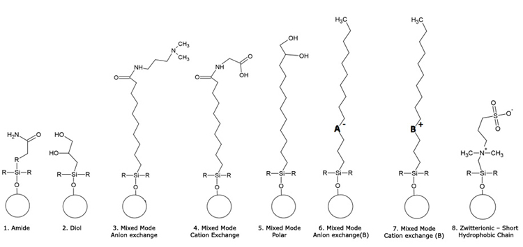 Bare silica, diol and amide phases are arguably the most popular for HILIC chromatography. However it should be noted that for more refined separations, in which the pH of the analyte or stationary phase can be used as a method development variable to alter retention and selectivity of the separation, ligands containing ionisable moieties are preferred. A range of ligands used for HILIC and so called mixed mode chromatography are shown below.