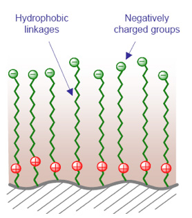 More highly hydrophilic species (purple) partition into the water rich layer at the stationary phase surface. Interaction at the surface occurs through dipole-dipole and hydrogen bonding between the surface's functional groups and polar functional groups of the analyte.