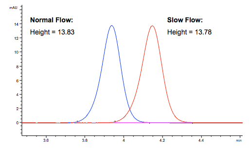 Flow rate reduced by 5%. Retention and peak area change – height remains constant.