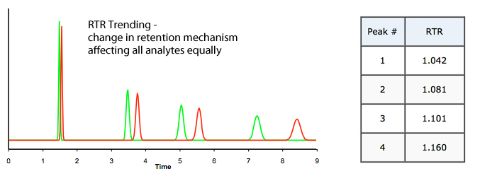 Retention Time Change Ratio (RTR) = Retention Time Original Chromatogram / Retention Time Problem Chromatogram