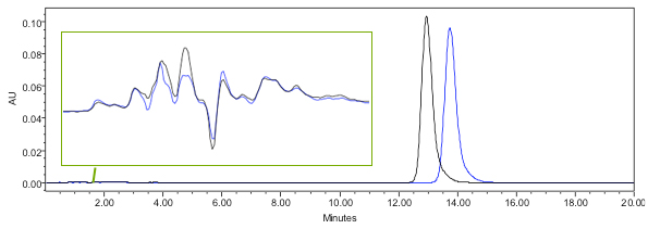 Example 2 – analyte retention time changes but void baseline disturbances overlay well – issue is probably with %B, Temperature or selectivity change.