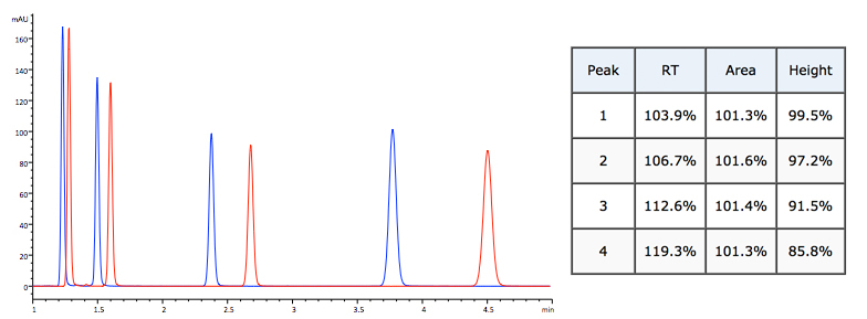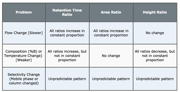 We can also run some checks using the peak area ratio (PAR) and peak height ratio (PHR) of the peaks of interest within the original and problem chromatograms to further confirm our diagnosis.