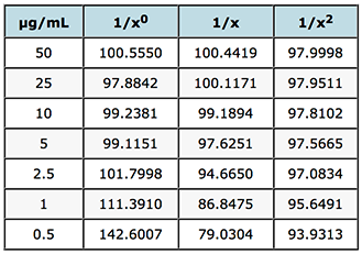 The value of S%RE is the sum of the relative errors and gives a good indication of the most appropriate weighting to use on the data. In this case of weighting of 1/x2 will result in the smallest errors in the interpolated values of unknowns across the whole calibration range. If we refer back to the FDA guidelines mentioned above – it calls for the ‘simplest model’ to be used (1/x0 in preference to 1/x and then 1/x2 etc.) to ensure the data meets criteria on maximum allowable error – and of course we should examine the data carefully to see which of the weightings would fall into this category by referring to the allowable error in the particular guidelines chosen.