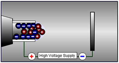 3. Once the droplet leaves the sprayer, as it has accumulated a vast excess of either cationic or anionic analyte ions (depending upon whether the instrument is operated in positive or negative ion mode), it travels under the influence of the applied potential difference between the sprayer and sampling orifice.