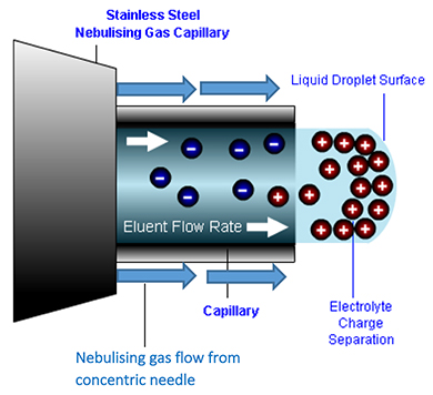 1. The HPLC eluent flows into a capillary nebuliser (sprayer) which is held under high potential difference, causing ions of opposite charge to be attracted towards the walls of the capillary and those of like charge to remain within the eluent flow. The charge on the capillary is selected to match the charge on analytes of interest, or to rapidly switch between positive and negative modes.