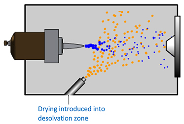 Figure 4: A drying gas is introduced into the desolvation zone to aid solvent evaporation from the sprayed droplets.