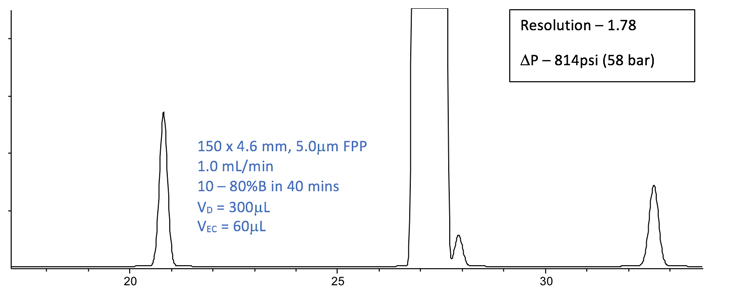 However, there are also situations in which the inherent efficiency increase achieved when using core-shell particles can be a great advantage. In the following example we used a system with a dwell volume of 300μL and extra column volume of 60μL, initially following the USP method. Figure 2 (top) shows that the resolution between the Lansoprazole and Lansoprazole RS A peaks would be unacceptable in a practical situation. Using the principles above, a method translation was produced which used a 2.7μm superficially porous particle with the same 150 x 4.6mm column dimension, which produced a significant improvement in resolution from 1.78 to 2.38, which may be usable in practice.