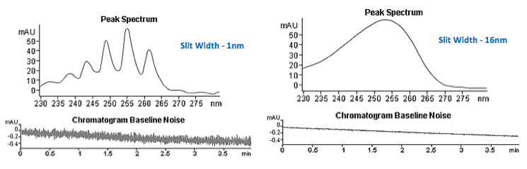 Some instruments include an electro-mechanical slit which is programmable. A narrow slit width provides improved spectral resolution for analytes which give UV spectra with enough fine detail to be useful for qualitative analysis. Improved spectral resolution will increase the confidence of library matching search results when attempting to identify unknown peaks within a chromatogram. A wide slit width allows more of the light passing through the flow cell to reach the photodiode array; hence, the signal intensity and detector sensitivity will increase. Baseline noise will also be reduced leading to an increase in signal to noise ratio. However, with a wider slit width the optical resolution of the spectrophotometer (its ability to distinguish between different wavelengths) diminishes. The wavelength of light falling on each diode becomes less specific as the light becomes more diffuse. Any photodiode receives light within a range of wavelengths determined by the slit width, and so spectral resolution decreases.