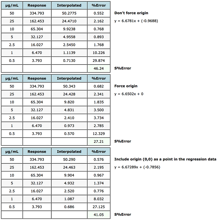 In our case above the magnitude of the intercept and Standard Error are very close - -0.9688 and 0.9402 which gives us a dilemma, fortunately in the majority of cases the decision to include the origin or not is much less ambiguous. Our rule tells us that the intercept should not be forced on this occasion, however let’s just take a look at some data which quantifies the errors in the interpolation of data from regression lines created when ignoring, forcing or including the origin.