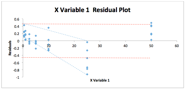 By combining all responses and concentrations into two contiguous columns with MS Excel and re-running the regression statistics described above we can get a fuller picture of the residuals spread for this particular analysis. The residuals plot shown in Figure 2 displays this data.
