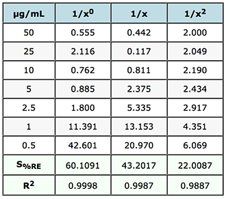 The value of S%RE is the sum of the relative errors and gives a good indication of the most appropriate weighting to use on the data. In this case of weighting of 1/x2 will result in the smallest errors in the interpolated values of unknowns across the whole calibration range. If we refer back to the FDA guidelines mentioned above – it calls for the ‘simplest model’ to be used (1/x0 in preference to 1/x and then 1/x2 etc.) to ensure the data meets criteria on maximum allowable error – and of course we should examine the data carefully to see which of the weightings would fall into this category by referring to the allowable error in the particular guidelines chosen.
